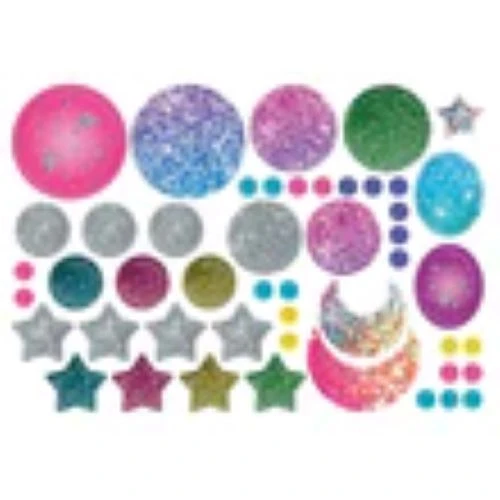 The kit contains: aluminium necklaces and rings, charms made of metallic and coloured plastic shaped like the moon and stars, holographic stickers and an accessorises holder.