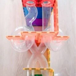 This open-ended expansion pack includes connector square magnetic tiles, wooden balls plus a range of clear, fluted tubes to allow you to explore motion and gravity like never before – an X-shape to re-direct and pivot the action, double-entry bowls for new ways to collaboratively play and race, spiral pieces for eye tracking fun, plus 1/2 and 1/4 pieces for twists and turns.