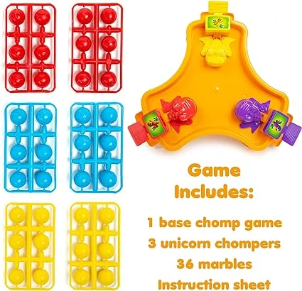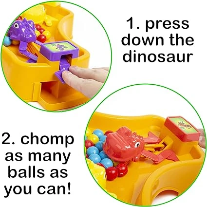 Press down on the button to make the dino chomp. Whichever dino has eaten the most marbles at the end is the winner!