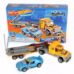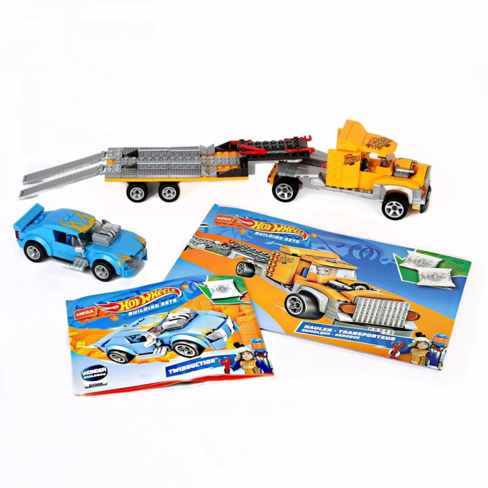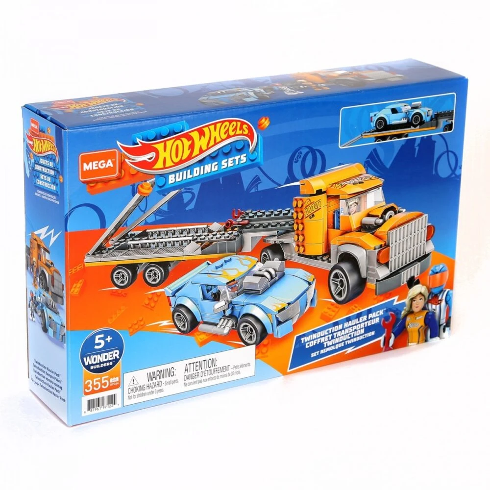 - ​ Hot Wheels racecar building toy with 2 vehicles; 1 racecar and 1 truck with trailer to haul Twinduction
