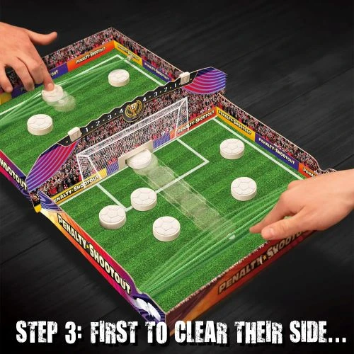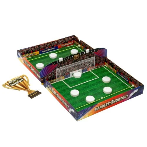 Penalty Shoot Out is the fast-fingered, addictive head to head, goal scoring game. Using the clever box which folds out to become your pitch, each player positions their pucks on their side of the half way line. When kickoff starts, who can flick all the pucks in their half through the goal into their opponent’s half? Sounds easy, but not when your opponent is flicking back just as fast!
