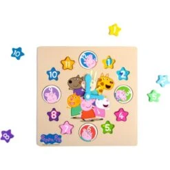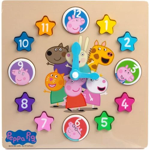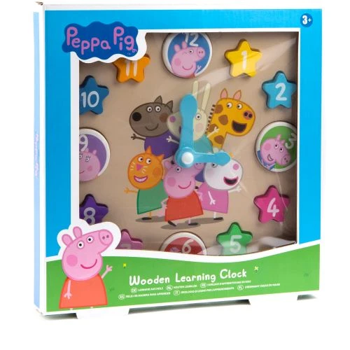 The Peppa Pig Wooden Learning Clock helps kids to learn how to count and tell the time! Piece together the puzzle using the numbered blocks and then move your hands on the clock to practice telling the time. The learning clock is easy to use and is printed with a colourful Peppa Pig design to help kids stay engaged.