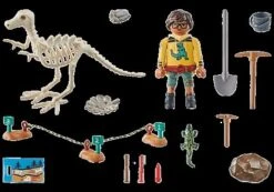 • The playset includes a PLAYMOBIL figure, a lizard, a dinosaur skeleton for assembly, a map, shovel, pickaxe, pen, and other research equipment for realistic role-playing in the children’s room.
