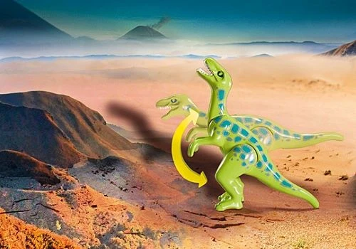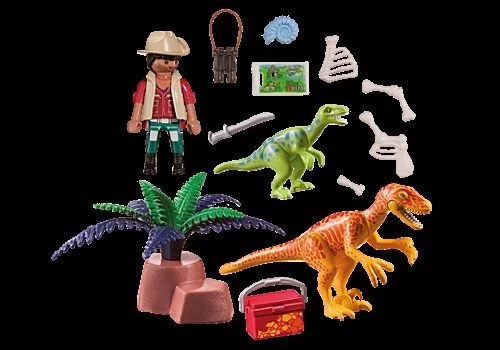 Figures: 1 explorer; Animals: 2 velociraptors; Accessories: 1 dino explorer carry case, 3 bones, 1 shell, 1 ride, 1 box with lid, 1 binoculars, 1 map