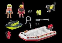Navigate through thrilling rescue missions with the new PLAYMOBIL Fire Boat with Aqua Scooter! Equipped with diving gear, the firefighter saves the distressed jet ski rider, aided by a specially trained water rescue dog. The floating boat features two seats with foot clamps, oars, and a swivelling outboard motor. When a figure is placed on the Aqua Scooter, it floats on water. The dog moves its head and tail, equipped with a removable life jacket harness. A fantastic playset for exciting role-playing and heroic water rescues in the playroom. The perfect gift or treat for little action heroes aged 4 and up!