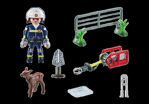 With the PLAYMOBIL set Firefighting Mission: Animal Rescue, every adventure becomes a wild and fun experience! A little fawn got caught in the fence, but the clever firefighter rushes to the rescue with his gear. With skilful rescue manoeuvres, he bends the fence and frees the frightened fawn. The hydraulic unit offers a choice between a rescue cutter and spreader, and the fawn can joyfully move its head. With removable glove attachments and a cool, movable visor helmet, every child becomes an animal-loving firefighter hero. This detailed PLAYMOBIL set not only stimulates creativity but also fosters a sense of responsibility β the ideal gift for aspiring rescuers aged 4 and up!
