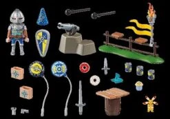 “Figures: 1 Knight (Arwynn) Animals: – Accessories: 1 knight’s helmet, 1 birthday hat, 1 shield, 1 sword, 1 dagger, 1 cannon on a rock, 2 projectiles, 1 barrel with wooden board, 3 cans, 2 donuts, 1 muffin, 1 fence element, 1 torch holder with fire, 2 flag pennants, 2 bags with target, 1 play sailboat, 1 doll, 2 balloons, 2 fence holders for balloons”