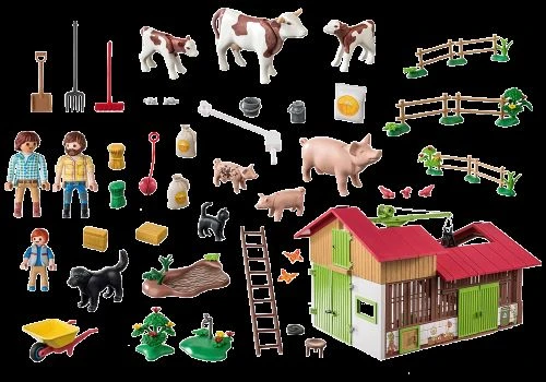 Discover fun farm adventures with the large farm playset from PLAYMOBIL! Use the extendable rotating loading crane to easily transport heavy loads into the farm. Charge the large tractor (71305 – sold separately) at the charging station using the engergy from the solar panels on the roof. Animals, of course, can not be missing on the farm: While the cows graze, the pigs enjoy a relaxing bath in the mud. With many farm animals and numerous accessories. The large organic farm from PLAYMOBIL invites children aged 4 and up to discover a new side of country life. The richly detailed sets with lovely characters inspire kids to imaginative roleplay adventures and encourage a mindful use of our natural resources.