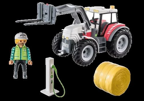- The 31-piece toy set includes a PLAYMOBIL figure, a tractor with a folding roof and movable forklift plate, as well as an electric charging station and other great extras.