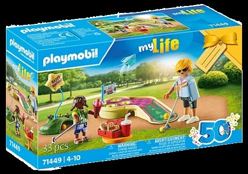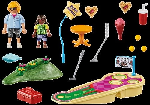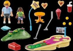 Endless play fun awaits Mini Golf fans with the fantastic PLAYMOBIL Mini Golf Gift Set. Thanks to the decorative packaging that can be personalised with the birthday childβs name, you save on gift wrap. The Mini Golf course offers plenty of excitement: the front area allows for the perfect ball placement for tee-off, while on the upper level, three additional holes serve as targets. The passage beneath the course can double as a tunnel, and the hill serves as an extra challenge. In the two-part container, you can store the sweet waffle hearts, while the golf clubs, paper airplane, ice cream cone, beverage cup, and balloon string have practical handles and can be held by the figures.