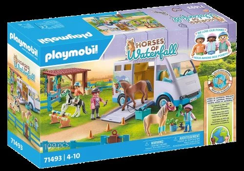 Embark on fabulous pony adventures at Waterfall Ranch with the Mobile Riding School with Transporter from PLAYMOBIL. Riding instructor Joana is a guest at the equestrian centre with her flexible horse transporter and is eagerly awaited by the children. In her spacious transporter, there is room for two horses, and above the trunk, there are two sleeping places in case the riding lessons take longer. Riding gear and horse accessories are stored in the trunk. In addition to a shelter, there is a paddock available for the ponies. The children are looking forward to the riding lessons.