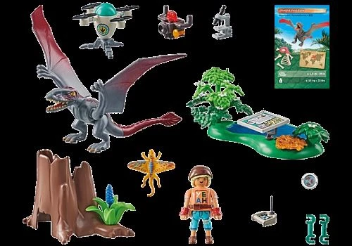 • Cool PLAYMOBIL Dinosaur set featuring a PLAYMOBIL figure, a Dimorphodon, a flying reptile, a drone with a camera, a microscope, a pond with plants, and many other fantastic extras.