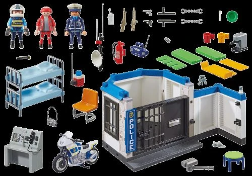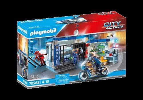 Today it seems to be quiet in the police station. But appearances are deceptive. Suddenly, strange noises come from the prison cell. The prisoner has escaped through the barred window. Quickly the policewoman reaches for the radio and informs her colleague. The policeman immediately takes up pursuit on the motorcycle. After a short time the crook is arrested and taken back to his cell in handcuffs. Now the policemen first allow themselves a cup of coffee. The playset contains three PLAYMOBIL figures, a police station with a prison cell and workstation, shelves and espresso machine, a police motorcycle and many other extras for exciting action police adventures.