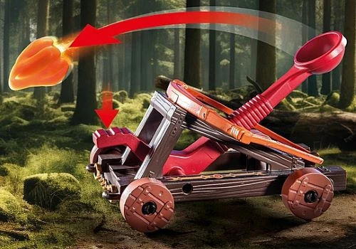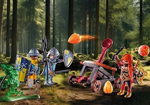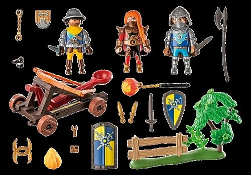 Figures: 2 knights, 1 lady knight; Animals: bird; Accessories: 1 catapult, 3 fire projectiles, 1 morning star with flame ball, 1 ring weapon, 1 sword, 2 shields, 2 knight helmets, 2 capes, 1 lance, 2 knives, 1 fence element with tree, 1 signpost to the castle