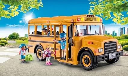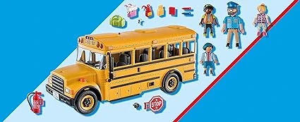 Time for school! Head out for a day of learning on the cool PLAYMOBIL School Bus. The functioning front and rear lights flash as the bus driver approaches the bus stop and extends the stop sign. Once the double doors open, the kids can climb aboard and choose a seat. Easily access the spacious interior, with seating for up to seven figures, thanks to the removable roof. Set includes 4 PLAYMOBIL figures a bus driver and three students. Accessory elements include backpacks, lunch bag, pencils, fire extinguisher, notebook and stop sing. Recommended for ages four to ten years. Warning. Choking Hazard. Small parts. Not for children under 3 years.