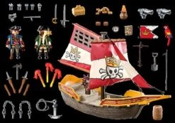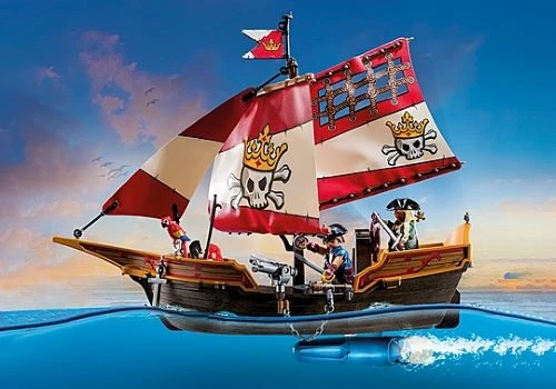 Set sail and embark on an adventure at sea together with sea monster hunter Manta-Hunter Myles and Pirate Queen Rohanna βRoβ Razor-Tide! Exciting pirate adventures await all pirate fans with the PLAYMOBIL Pirate Ship. This detailed set includes a pirate ship with movable sails, rotating cannons, two PLAYMOBIL figures, a parrot, an anchor, and plenty of other details and cool accessories. The ship is floatable and can be upgraded with an underwater motor (7350 β sold separately). Five foot clamps on the deck ensure a secure standing for the figures.