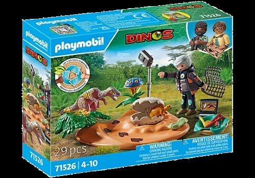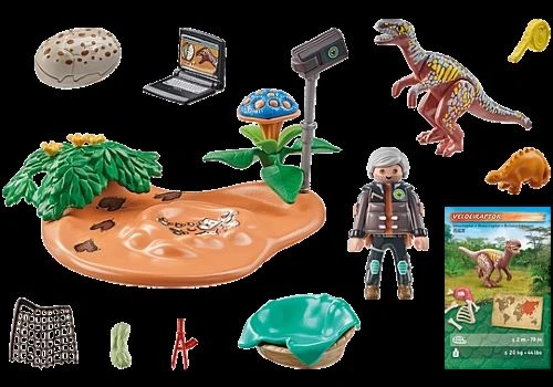 • Detailed playset featuring a PLAYMOBIL figure, a Velociraptor, a baby Stegosaurus, an opening dino egg, laptop, camera, basket, and many other exciting extras.