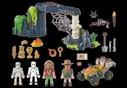 On their treasure hunt, two adventurers come across a ruin whose entrance is guarded by a skeleton. They transport the salvaged treasures, along with a lot of equipment, in their quadbike with pullback motor.