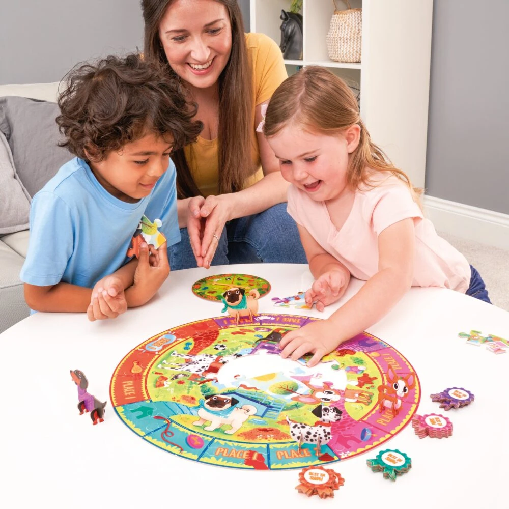 The race is to get around the board first and get your pooch back to their fully built kennel. But beware other pooches may take away one of your kennel pieces to slow you down!