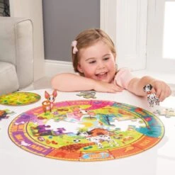 Players take turns to spin the spinner and take an action; Move 1 space, Move 2 spaces to move around the board, whilst building their kennel from puzzle pieces.