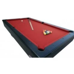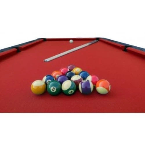 The First Pool table comes complete with four wooden cues measuring at 145cm in length, 1 set of numbered pool balls with a diam. of 57mm, and 1 white ball with a diam. of 54mm. The table is also delivered with 1 Triangle, 1 brush, 6 chalks, 1 plastic cover, and 1 four cue metal holder that fixes onto the side of the table.