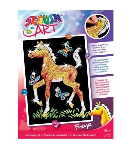 This shimmering sequin art project displays the majestic creature galloping along grass and flowers with sparkly butterflies in the sky. Placed upon a rich black background means the tones and expression of the horse can really come to life. The glittering bronze and gold body contrasts beautifully with the bright silvery mane and tail.