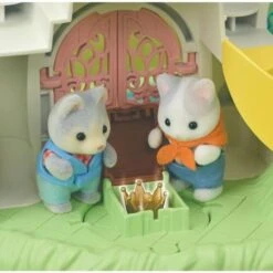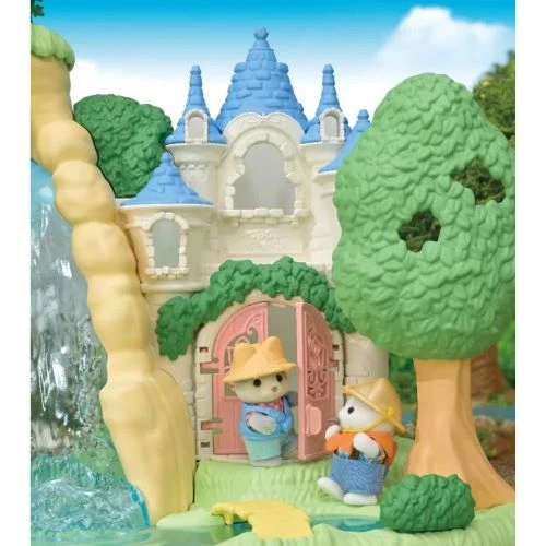 With a life jacket, lantern, flag, fishing rod, explorer’s hat and more, she’s ready to go! First she needs to find the key to the treasure chest! There are lots of places to search—a bucket lift, an ivy ropeway, a tree house, a big waterfall with a cave behind it, a little secret trail, a lifting bridge and more! Turn the floor of the castle and the treasure chest will appear! Open it with the key and take out the treasure inside!