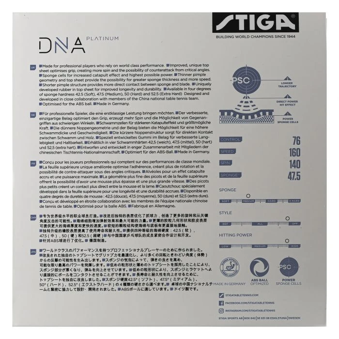 DNA Platinum is the latest addition to STIGA’s DNA series that features a new generation of table tennis rubbers from Germany. This rubber is best suited for professional players who have a really offensive playing style and expect the highest quality materials. The unique rubber composition provides an excellent grip, allowing the player to strike the ball from really challenging angles. The short pimples together with the thin top sheet means that DNA Platinum can accommodate a thicker sponge (up to 2.3 mm), which gives you additional speed and power in the game. Thanks to the PSC (Power Sponge Cell) technology, you get a longer ball trajectory with more power in your stroke and an aggressive arc in loop play. The sponge pores also enhance the contact between the rubber and the blade, which means that you get that sought-after, crisp sound in your stroke. The medium hard sponge offers the perfect balance between control and speed, making it possible to complete duels on the third round or to play with a lot of spin without compromising on control.