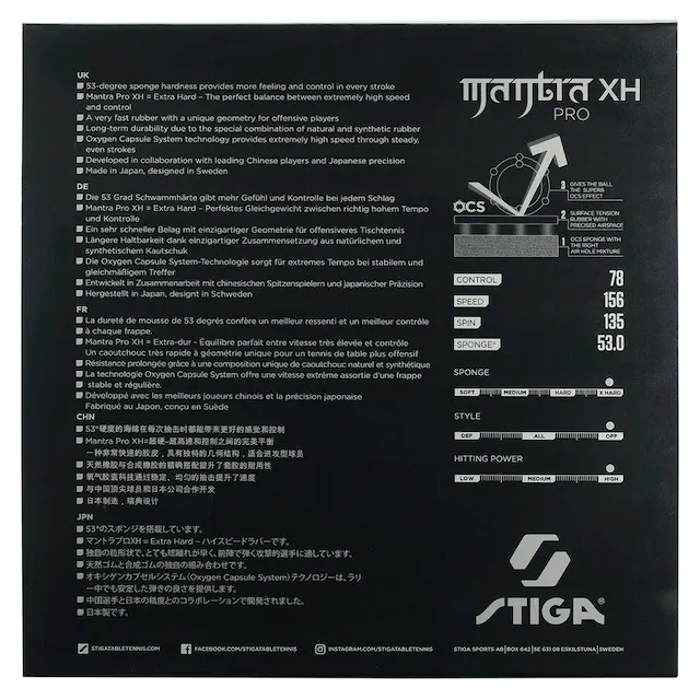 Mantra Pro HX has a unique geometry that has been specially developed for the aggressive player, who seeks a lot of power and spin. The rubber is adapted to suit a wide range of table tennis players and playing styles, from young talents to professional players who expect a world-class rubber of uncompromising quality. Suitable for technically skilled players with a modern, highly offensive playing style, the Mantra Pro HX is engineered with Japanese precision and distinction. It has also been designed and tested in collaboration with leading Chinese players. The result: a table tennis rubber for players who are keen to attack, play with a lot of power and seek a rubber that delivers in line with their expectations. The table tennis rubber is also equipped with OCS (Oxygen Capsule System) technology that, thanks to the enlarged sponge pores, generates a higher arc and catapult effect during loop play. It also contributes to a crisp, clear sound and more feeling in every stroke, as the contact between the rubber and the blade has been reinforced. Mantra Pro HX has a very hard, 53-degree sponge, which offers players an incredible amount of speed, power and precision, with a lot of spin and the possibility of quick, explosive finishes. Mantra Pro HX places high demands on the player’s technique to maximise the potential of the rubber. The rubber is also optimised for the ABS ball, and thanks to the special combination of natural and synthetic rubber, it is considerably more durable than previous generations of table tennis rubbers.