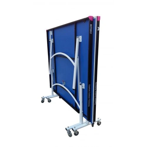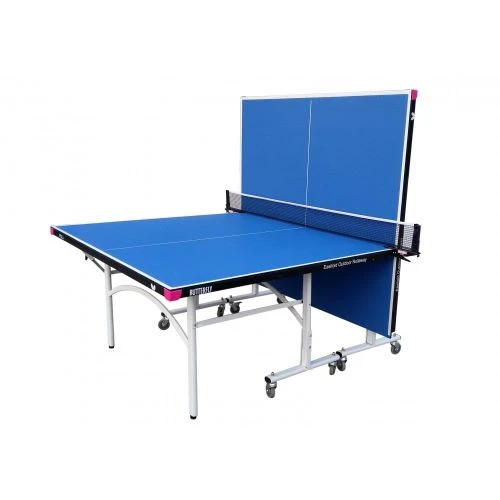 With a Butterfly 5mm melamine weatherproof playing top, this table provides a good bounce and playing performance combined with an 8 wheel system with economic storage and lighter rollaway benefits. This table is ideal for hotel and home use. It divides into 2 halves which makes movement and storage simple and easy. It comes with a full length cover, outdoor net and post set, 2 bats and 3 balls.