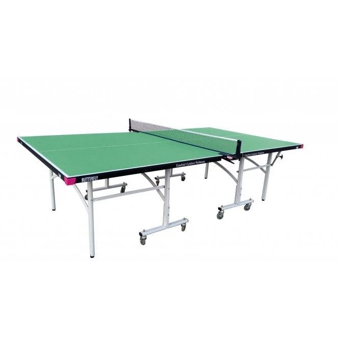 With a Butterfly 5mm melamine weatherproof playing top, this table provides a good bounce and playing performance combined with an 8 wheel system with economic storage and lighter rollaway benefits. This table is ideal for hotel and home use. It divides into 2 halves which makes movement and storage simple and easy. It comes with a full length cover, outdoor net and post set, 2 bats and 3 balls.