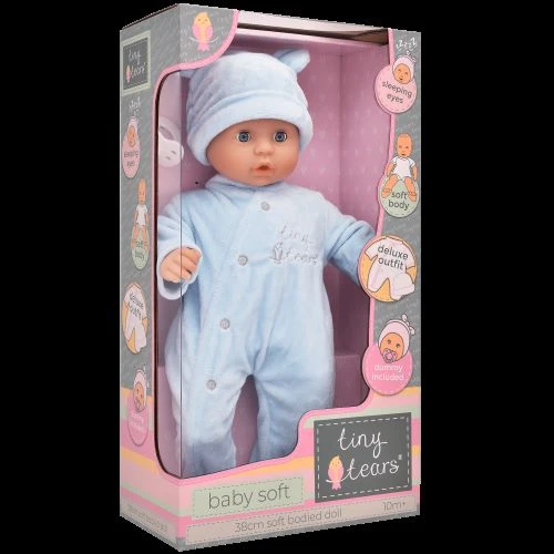 The Baby Soft Doll is a 38cm soft bodied doll and features a deluxe soft baby blue outfit. Little ones can snuggle up to their Tiny Tears doll and give them lots of love and attention, just like you would with a real baby.